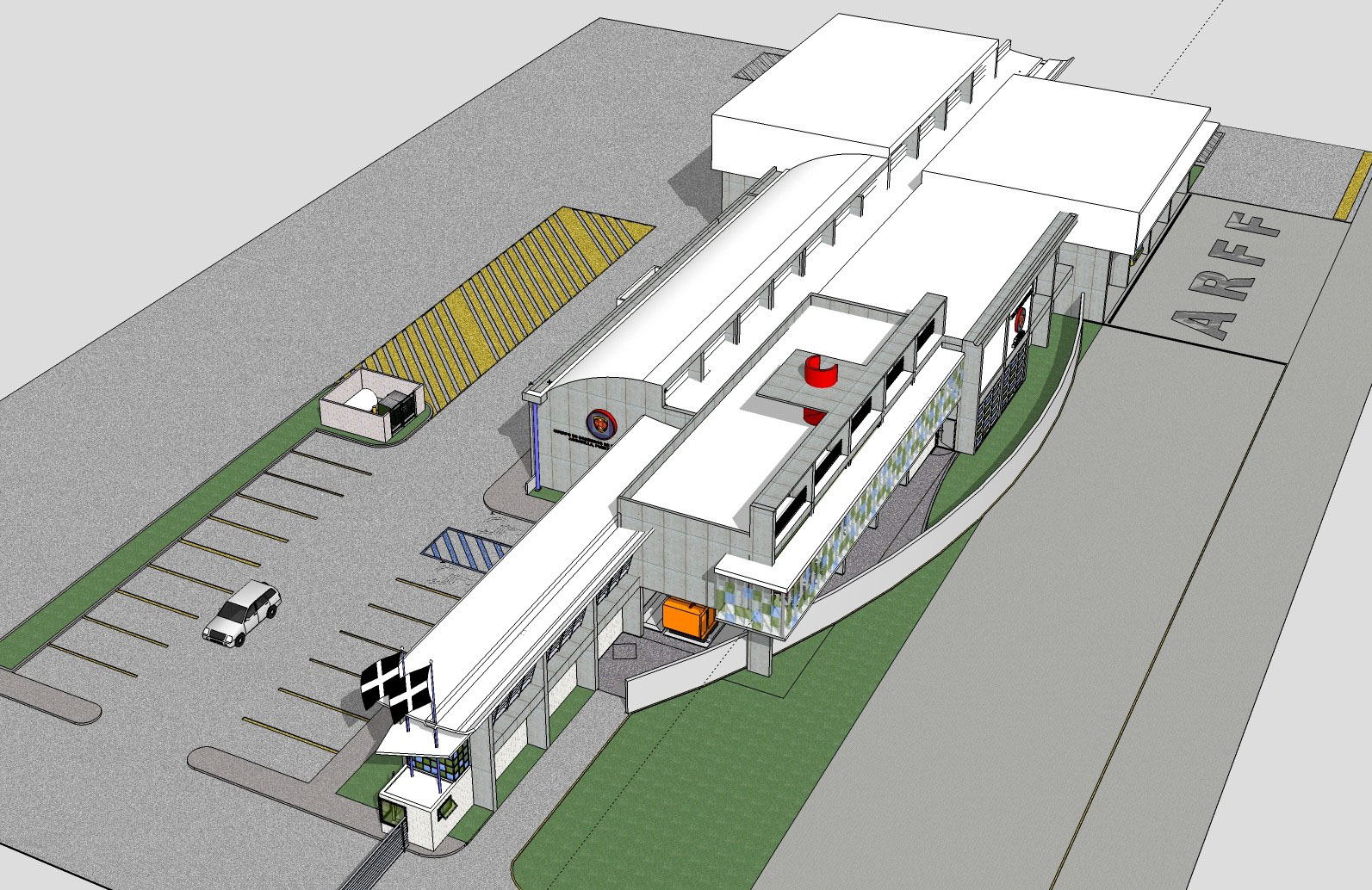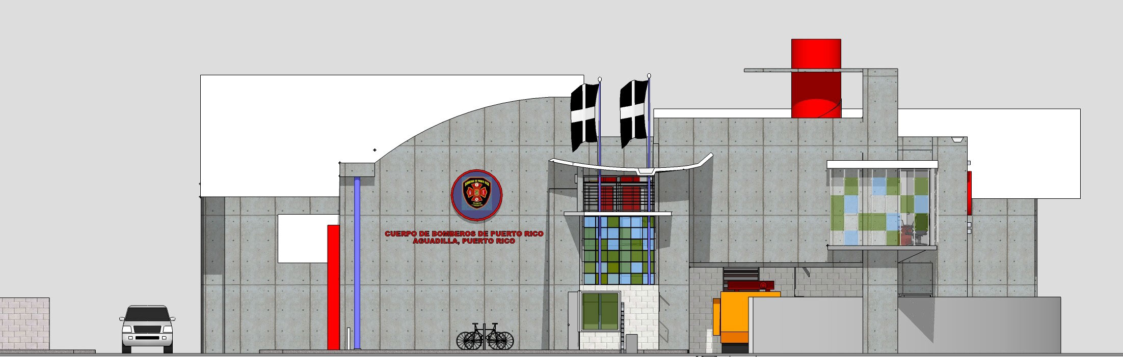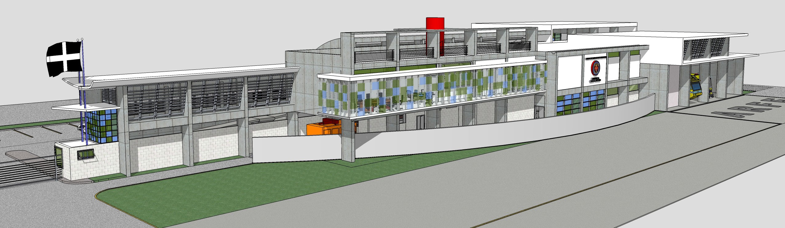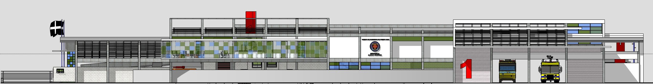 The two story building is designed for self-sufficiency. All disciplines highlight the sustainability design that provides better environmental quality and lower maintenance costs for the owner. The exposed concrete provides an opportunity to reduce maintenance costs, avoiding the need for exterior paint. The curved roofs at different levels allow the uptake of rain water, which is stored in an underground cistern and then filtered to use. The north and south window walls provide natural light to offices and training rooms, reducing the use of lamps during the day. The tempered glass windows are highly efficient reducing electrical costs with a lower demand for air conditioning. Also the building uses solar panels that feed on sunlight to heat water for the kitchen and bathrooms.