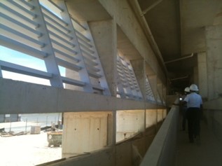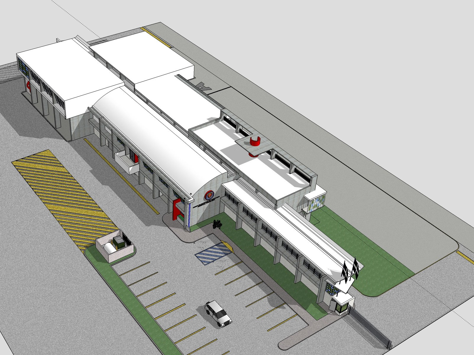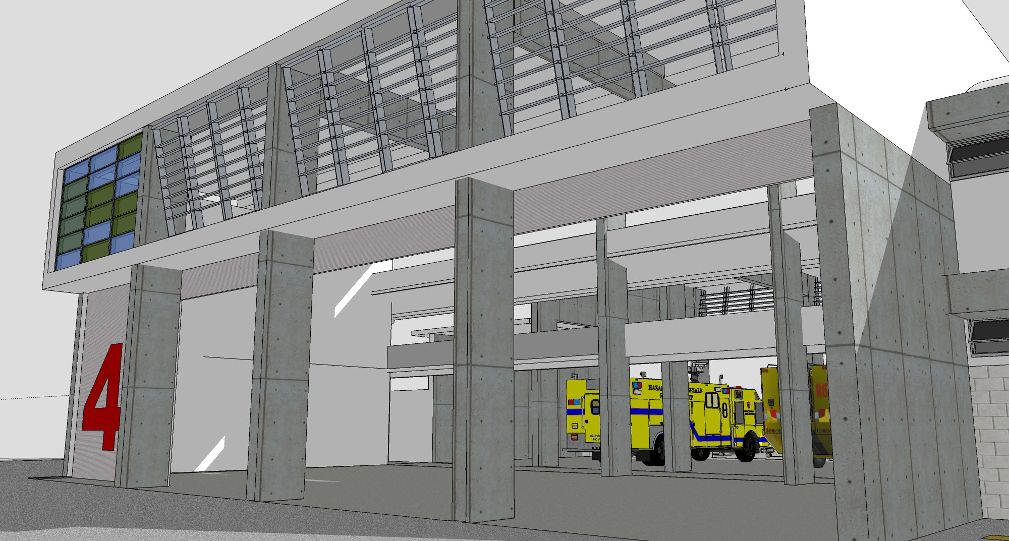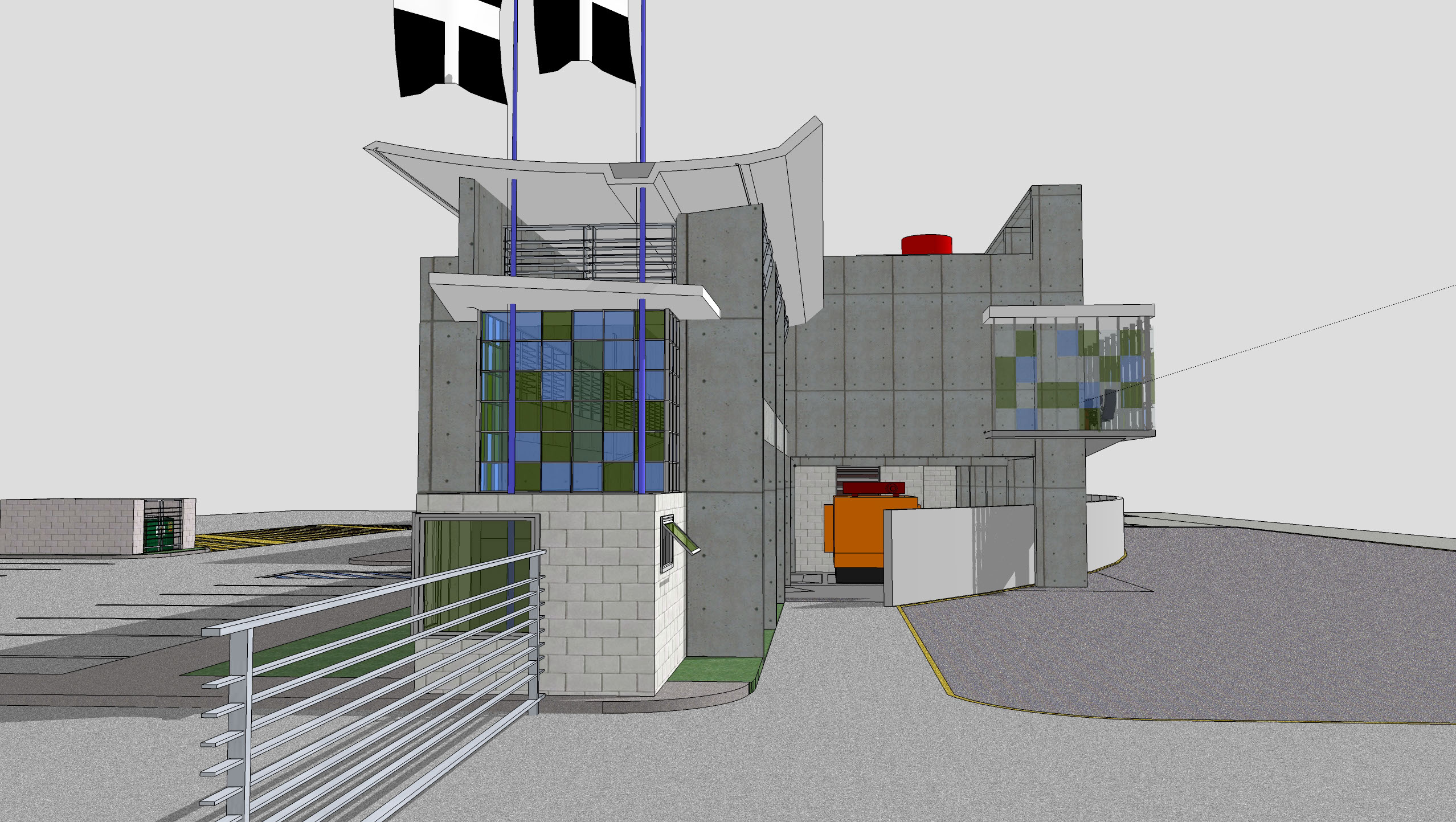 The two story building is designed for self-sufficiency. All disciplines highlight the sustainability design that provides better environmental quality and lower maintenance costs for the owner. The exposed concrete provides an opportunity to reduce maintenance costs, avoiding the need for exterior paint. The curved roofs at different levels allow the uptake of rain water, which is stored in an underground cistern and then filtered to use. The north and south window walls provide natural light to offices and training rooms, reducing the use of lamps during the day. The tempered glass windows are highly efficient reducing electrical costs with a lower demand for air conditioning. Also the building uses solar panels that feed on sunlight to heat water for the kitchen and bathrooms.